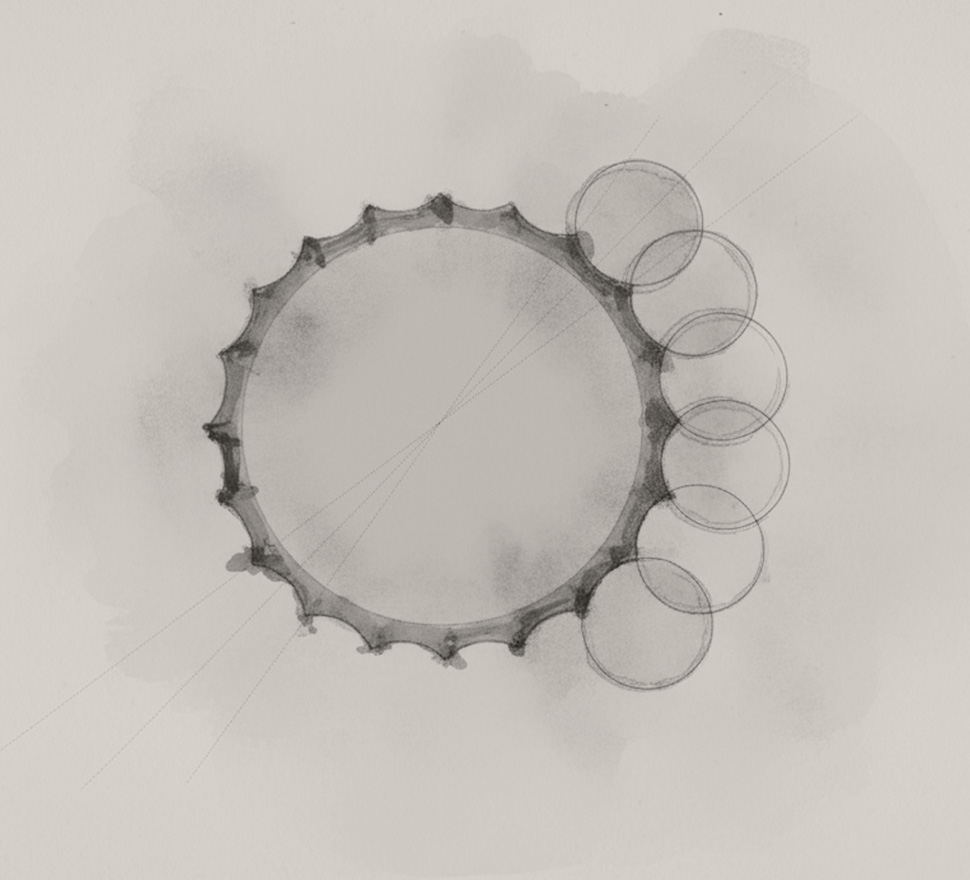 Un decoro a semicerchi è inciso con rigore geometrico nella ghiera cilindrica, a ricordare il ritmo scanalato di una colonna dorica.