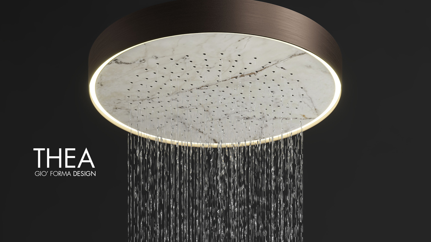 Il concept estetico di THEA nasce da un’idea precisa: mimetizzare il soffione trasformandolo in un elemento decorativo che dialoga con l’architettura dell’ambiente doccia. Il protagonista è un disco di 32 cm di diametro con superficie effetto pietra, caratterizzata da venature naturali studiate per camuffare gli ugelli di erogazione dell’acqua. Quando il soffione non è in funzione, l’oggetto appare come una grande superficie materica sospesa, intrigante e quasi enigmatica nella sua funzione.