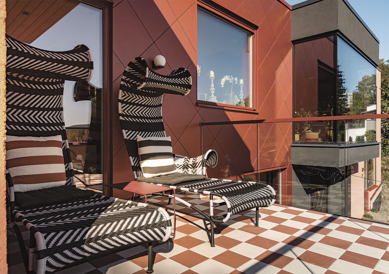 An open space, with a blend of intimate and more convivial areas, where large windows offer up vistas of the outdoors through cherry-red frames. This is the same tint as the diamond cladding on the exterior walls, underscoring the building’s volumes and portions. A colour-blocking technique that also unites the interior design and the bathrooms in particular. This stylistic choice encompasses spacious surfaces adorned with blocks of colour across the entire wall, here made with ceramic coatings in decisive tones, where blue, red and green alternate expertly for an original and delightful effect.