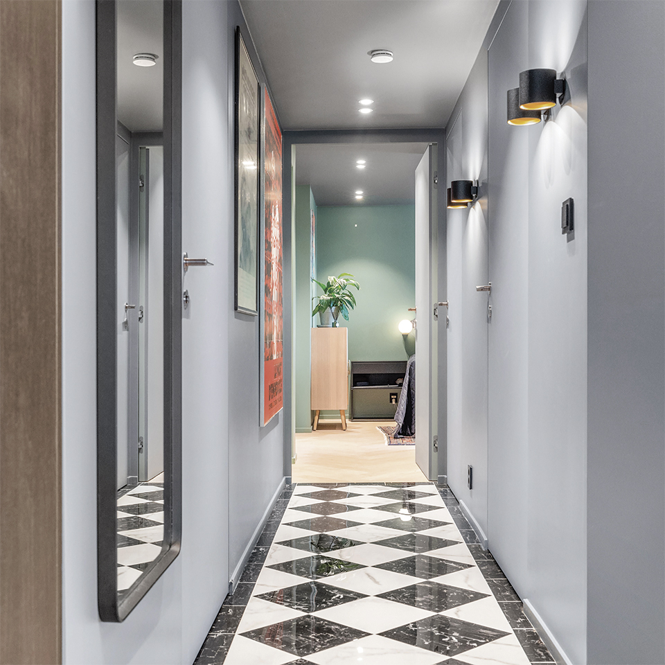 The property represents a high-impact residential project, split into two luxury apartments that stand out for their unique personality and the strong capacity to dare with new colours and combinations. Each room is designed to be a welcoming and dynamic atmosphere, where the beauty of contrasts blends with a refined and contemporary design, where many elements are tailor-made to customise the living space.