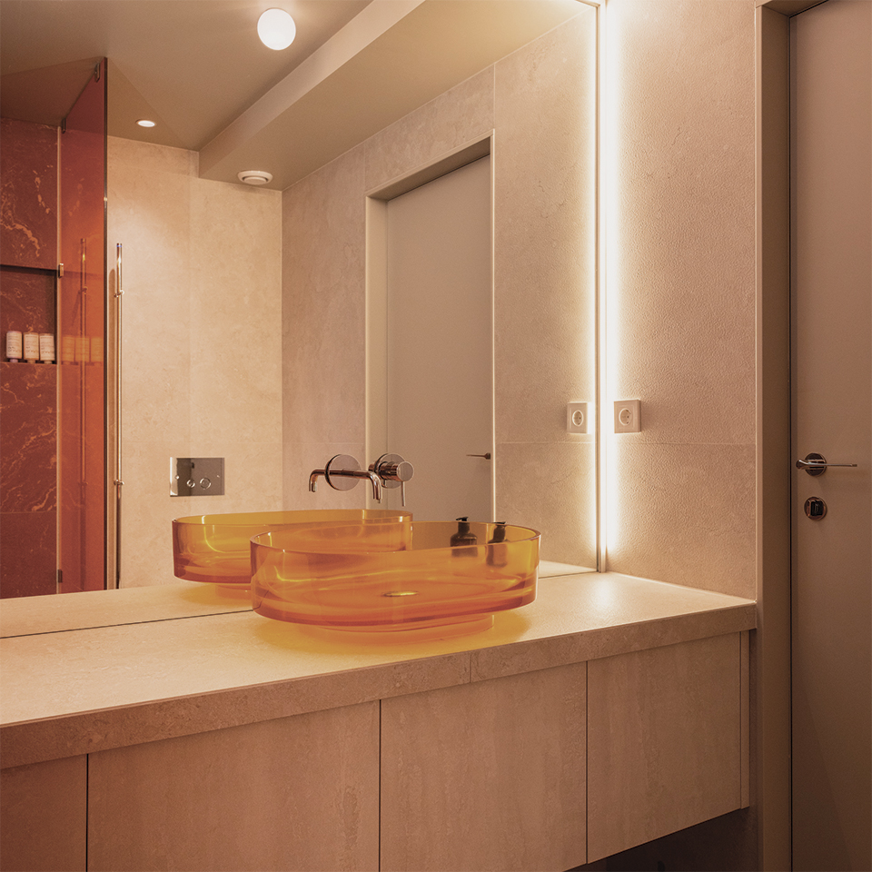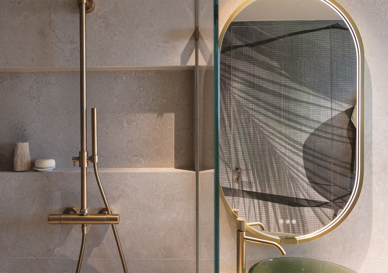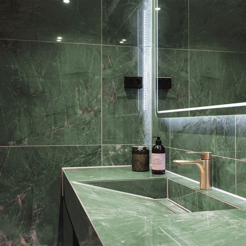 The Spillo Up, Spillo Tech and Mast collections have been selected for their elegance and functionality, with finishes in brushed gold and stainless steel, perfectly in tune with the bold and sophisticated design of the rooms themselves. Combined with the brushed gold or chrome finish, the subtle and minimalist lines of the SPILLO UP and SPILLO TECH series add a touch of timeless luxury. The MAST series, also in brushed gold, is refined by elements of emerald green and ocean blue furniture, creating a visual contrast that enhances the depth and character of the spaces. The painstaking selection of finishes not only reflects the concept of elegance but is also in perfect accord with the overall harmony of the environment, where each detail is designed to offer a unique visual and tactile experience.