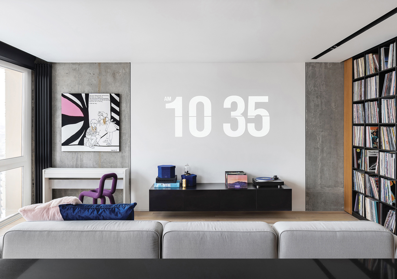Non è un’opera d’arte, ma sicuramente un punto focale del progetto, la scaffalatura realizzata su misura nella zona living per ospitare gli oltre 2000 vinili collezionati dai committenti, appassionati anche di musica.