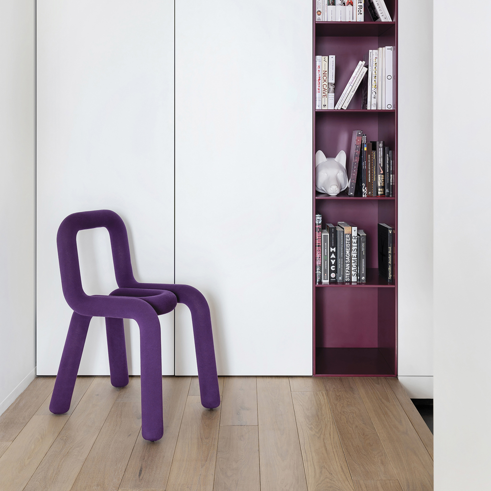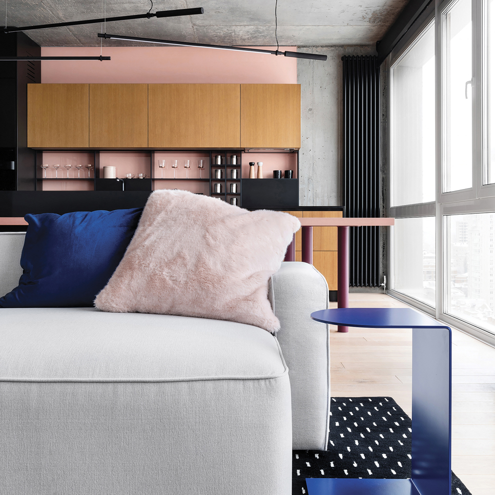 Essenziale e contemporaneo VOV apartment gioca su una palette di colori neutri su cui spiccano accenti vivaci ed intensi. La base è quella del cemento grigio dei soffitti e degli elementi portanti della struttura, mantenuti allo stato originale salvo un trattamento anti-polvere, dell’intonaco bianco delle pareti e del parquet in legno naturale del pavimento. I tocchi di colore invece sono distribuiti nello spazio, tra gli arredi blu cobalto dal gusto pop, i mobili su misura, come la libreria viola sotto la scala in metallo, e lo schienale della cucina in vetro rosa che gioca con le scaffalature nere e i piani di lavoro in tinta o a contrasto.