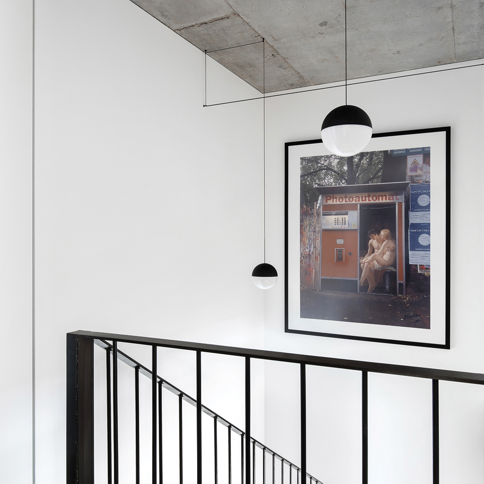 Nell’open space il focus è l’angolo vicino alla finestra, in cui il pianoforte digitale si appoggia alla parete in cemento dove spicca un dipinto dell’artista Francoise Oz. Sopra le scale è stato invece collocato un collage di Oleksii Kondakov, individuato proprio in base alle specifiche dei progettisti che volevano un quadro grande e verticale da accostare all’installazione luminosa realizzata con le lampade di Flos. Nella camera padronale invece trova spazio sopra la testata del letto un colorato quadro astratto di Stepan Ryabchenko.