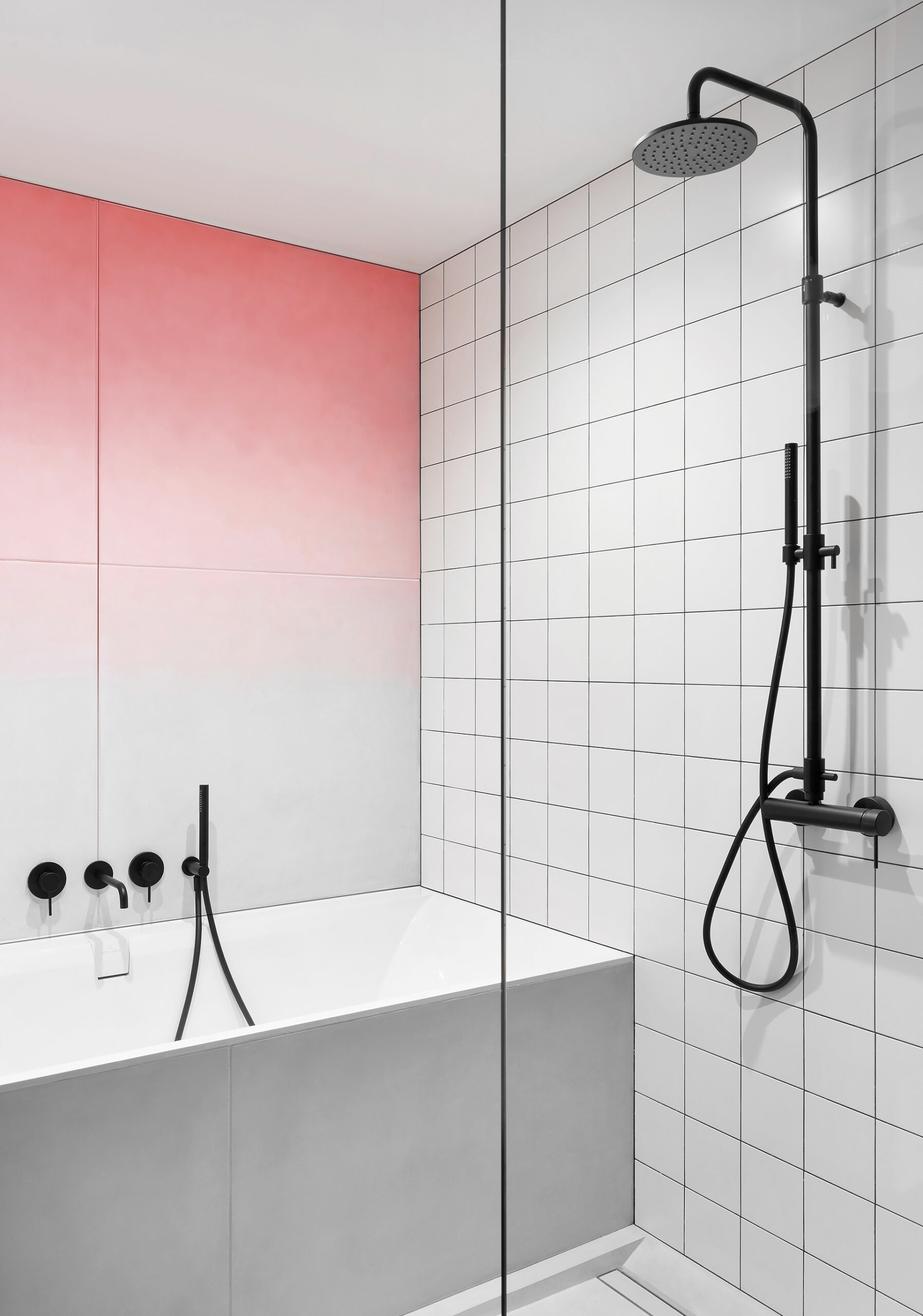 Le tonalità rosate invadono lo spazio da soffitto a pavimento, stupendo al primo sguardo. Sono rosa i blocchi di cemento della parete non intonacata, rosa i rivestimenti, rosa il pavimento in resina autolivellante. L’elemento centrale è invece un lavabo a consolle in acrilico con motivi grafici black&white, dove il dettaglio nero rilancia il colore delle rubinetterie. Troviamo qui infatti la collezione SPILLO UP di FIMA in versione Black Matt, una finitura intensa e piacevole al tatto capace di rendere tanto elegante quanto pop lo stile di un bagno. Il modello scelto è un miscelatore due fori da parete che consente di lasciare il piano libero e pulito nelle sue geometrie.